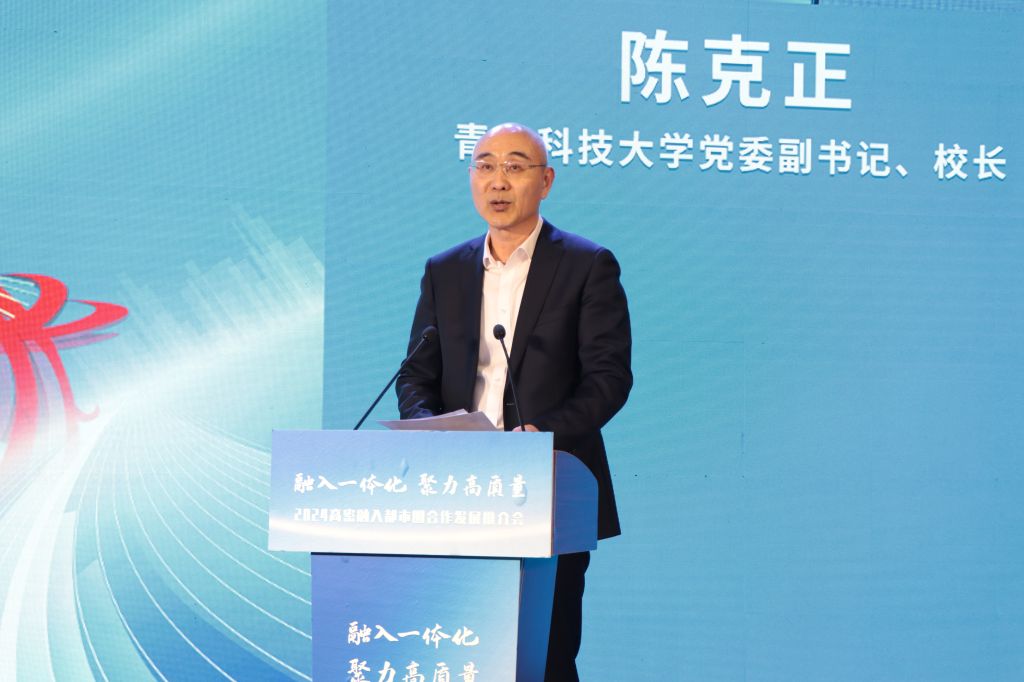 陈克正向推介会的成功举办表示祝贺,并对高密市经济社会发展取得的成绩表示赞赏。他在致辞中介绍了学校74年来“服务国家战略、服务区域发展、引领行业进步”的办学历史,并重点回顾了学校与高密市合作共建高密校区的奋斗历程。他指出,学校选择在高密市建设校区,既是看中了高密市“物华天宝、人杰地灵”的先天条件,也是受高密市的政策环境、发展环境、干事环境、服务环境所吸引,更是被高密市委市政府领导班子勇于担当、敢于作为、真抓实干、奋勇争先的精神品质所感动;在高密市委市政府的关心支持下,高密校区的发展日新月异,累计培养毕业生15500余名,打造了“青科大一号”卫星数据接收基地等多个平台中心,为高密市经济社会高质量发展提供了人才与智力支撑。他表示,青科大将依托高密校区,充分发挥学科专业优势特色,持续深耕“有组织拔尖创新人才培养”“有组织科学研究”和“有组织服务经济社会发展”,与高密市携手探索校地协同的高质量发展道路,为推进青潍一体化、融入都市圈,助推高密市实现新的腾飞,不断提供“青科大方案”、贡献“青科大力量”。