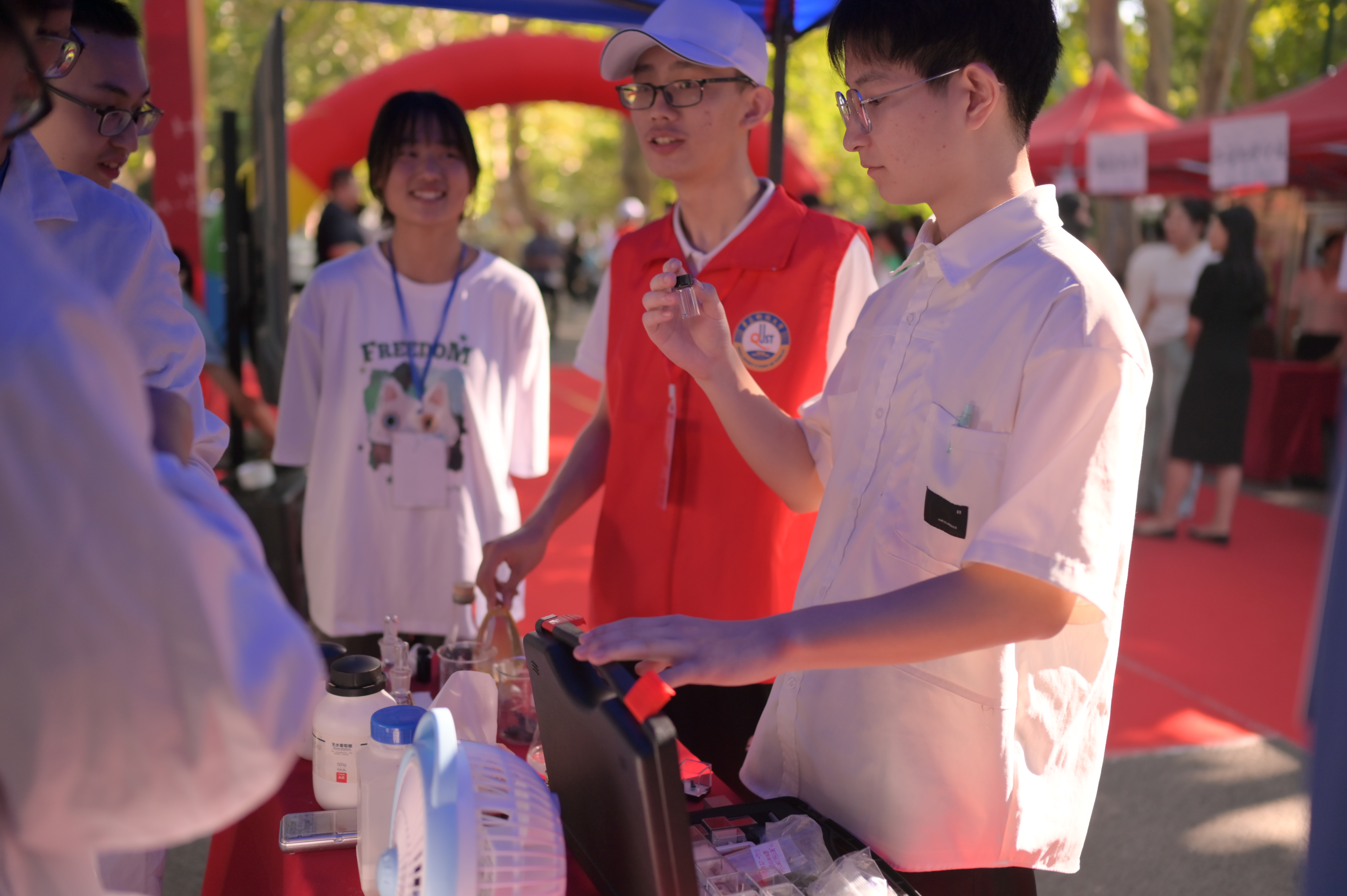化学院结合学院专业特色,带领家长、学生实地参观实验室,并安排专门的老师进行讲解,让学生对专业有更直观的认知,也让家长感受到学院的科研实力。邀请化学爱好者协会在迎新现场布置化学科普实验,由协会成员向新生展示自制的“蓝晶雨”“风暴瓶”等化学趣味实验,突出化学特色,传播化学知识,吸引新生自己前来动手操作,体验化学实验的奥秘,通过现场的实验演示和体验,培养新生对专业的兴趣和热爱,激发新生积极向上学习态度。