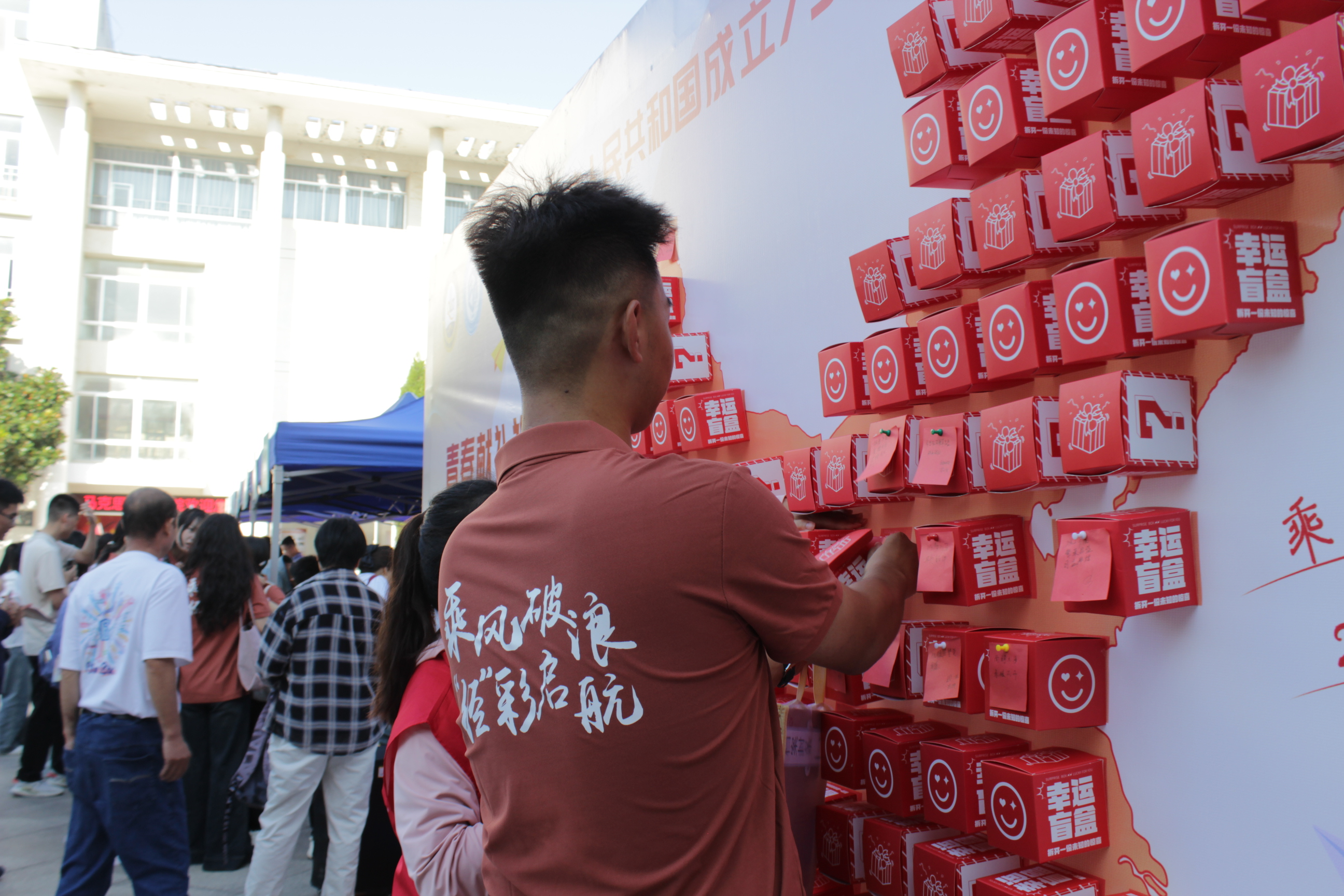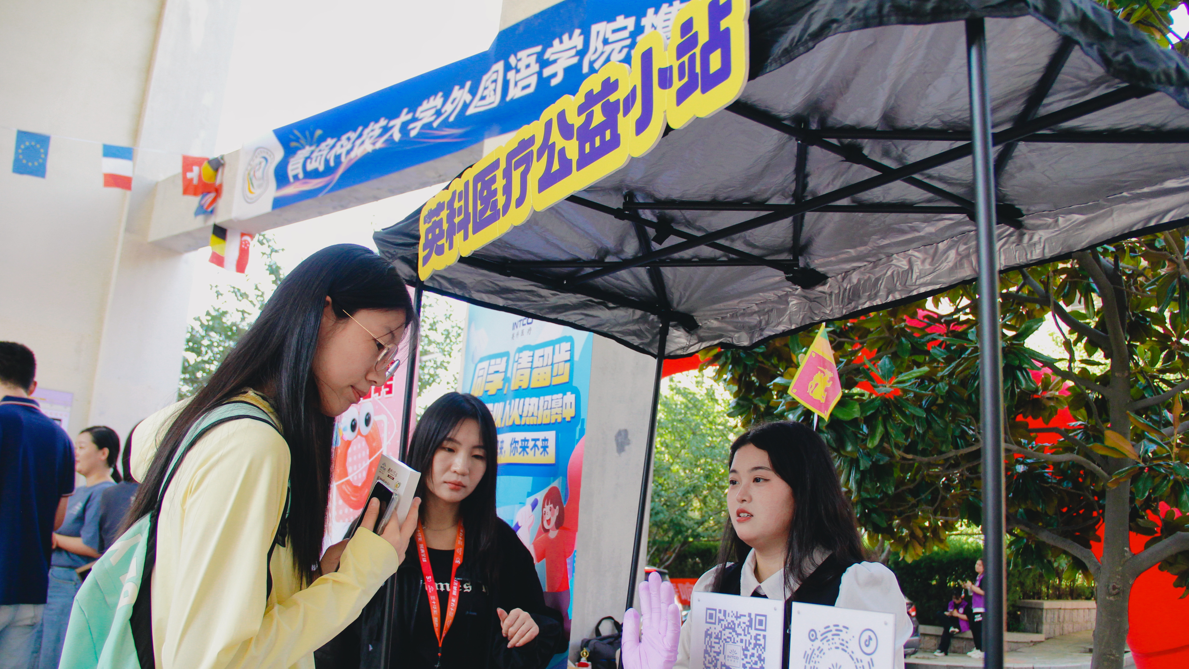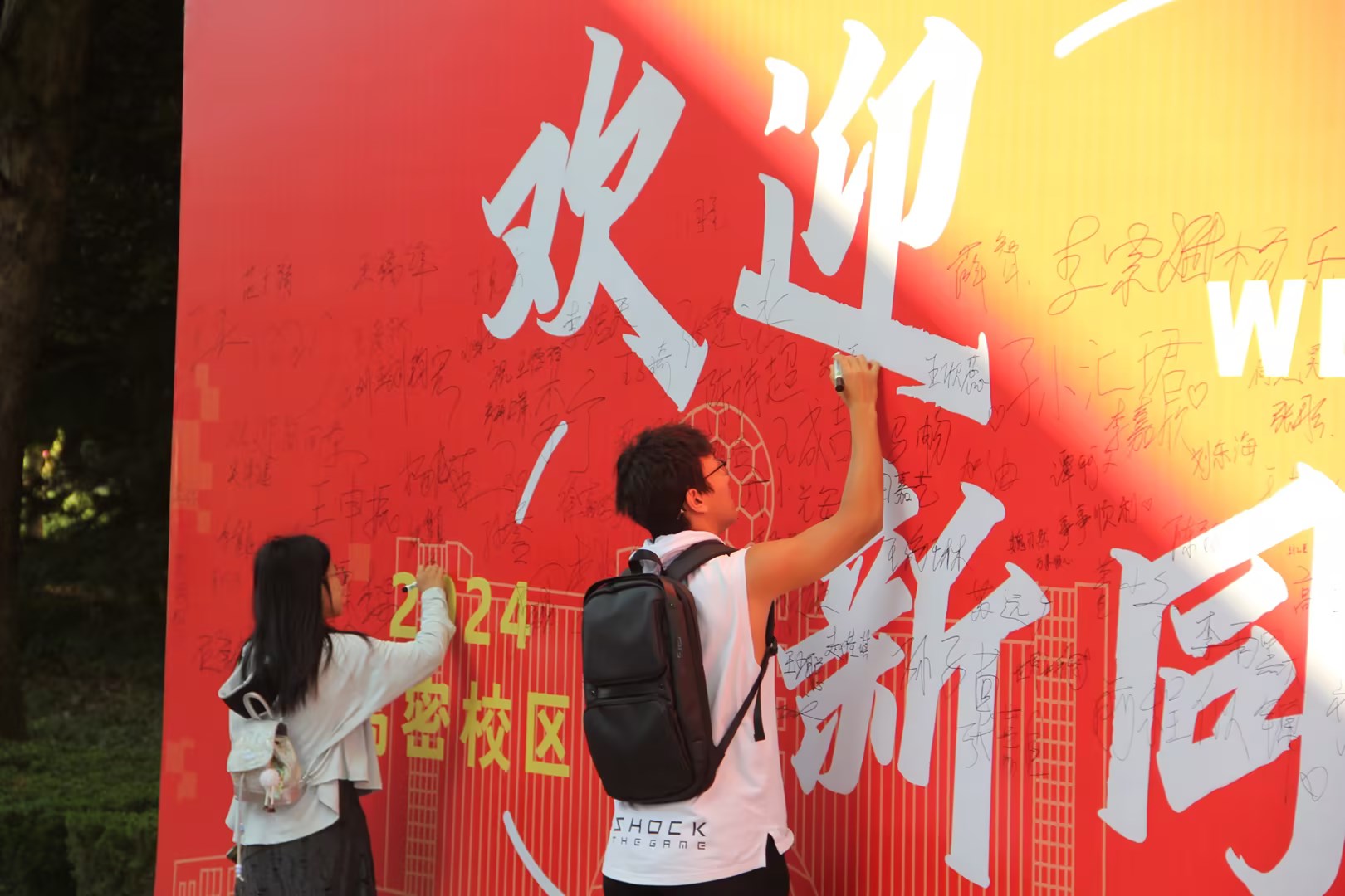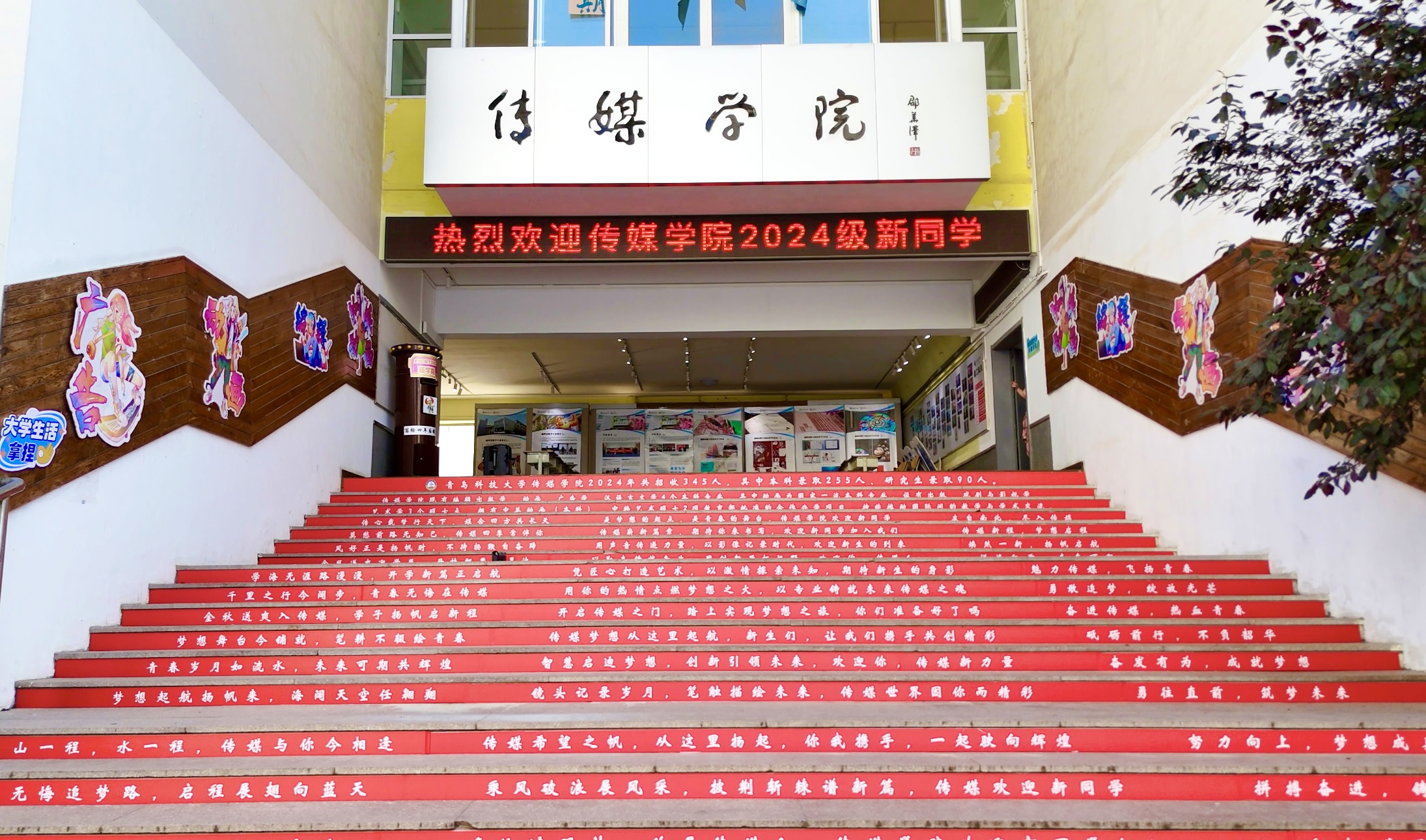 高密校区创意无限,“五新”迎新:爱新,迎新现场,设置五处背景打卡点,在“大学第一照”摄影体验区,新生入学拍照即拍即打即装框,作为进入大学后的第一份纪念礼。荣新,为新生精心准备了“一对一”新生大礼包,内含QUST主题的文创用品,以“校兴我荣”的理念体现校区对新生的关心关怀。明新,打造学科竞赛、就业光荣榜两大宣传展区,让新生们在入学伊始就能对自己四年的大学生涯有初步的感性认识。护新,党员先锋岗、家长休息区、迎新服务点,多渠道多部门为新生及家长提供周到服务。同新,在“迎新活动展示区”,朋辈辅导员们安排了包含科技创新、国防教育、才艺快闪等元素的校园展示活动。