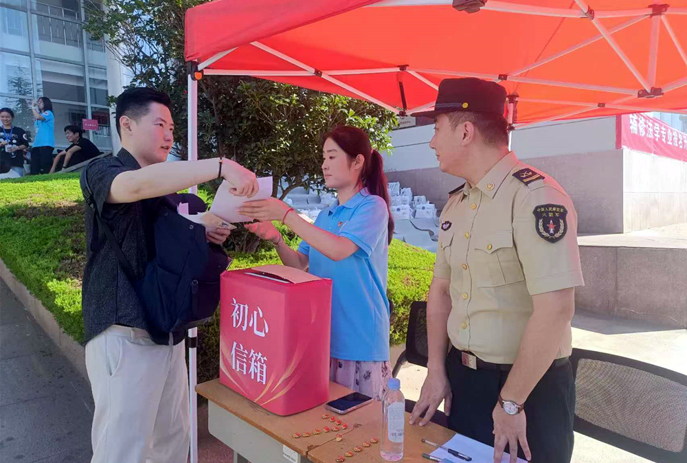 法学院精心拍摄《獬豸传说》视频,让新生了解法学、热爱法学;设置职业体验打卡点,准备法官袍、律师袍等供新生体验打卡,感受职业魅力,增强专业认同感。设置党员先锋岗,放置“初心信箱”,加强入党启蒙教育,50余名新生现场递交入党申请书;设置征兵政策宣传站,学院优秀退役大学生士兵进行政策宣讲,加强国防教育;现场发放新生大礼包,包含獬豸等特色文创产品。
