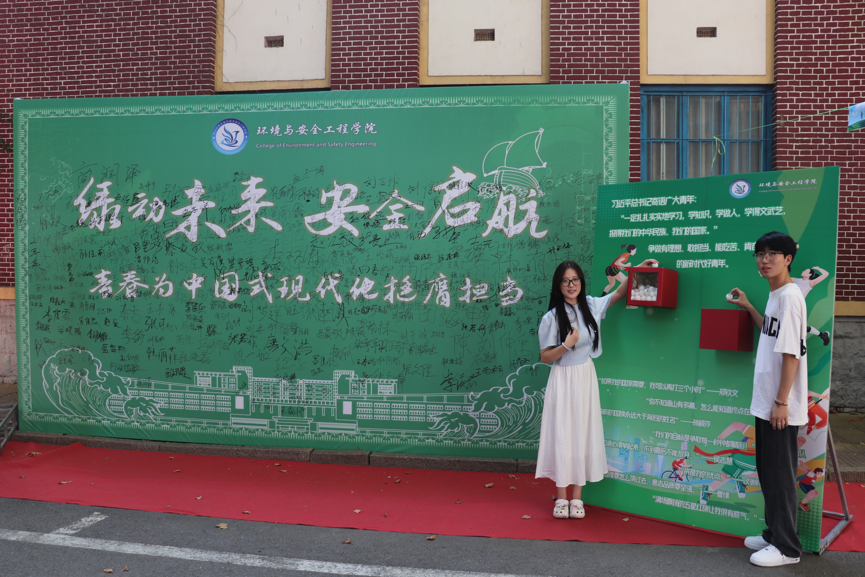环境学院结合环境与安全两大专业特色,围绕“绿动未来 安全启航——青春为中国式现代化挺膺担当”主题,突出“绿色”基调主题喷绘、设置“你好新同学”拍照打卡框吸引众多新生签名、拍照;融合奥运健儿励志语录与国乒元素创新设计运动展板,附置幸运抽奖盒引导新生塑造奋力拼搏的体育精神和“爱体育·兴科大”的校园文化;考研龙虎榜、高质量就业去向以及连续10年涌现17个”学霸宿舍“风采展彰显环境学子扎实学风;迎新现场悬挂特色文化长廊,营造浓厚校园学术氛围;依托党员先锋岗,提供集专业、科创、家校等一体化服务站点,为新生及家长提供全方位帮助,将三全育人贯穿迎新工作全过程。