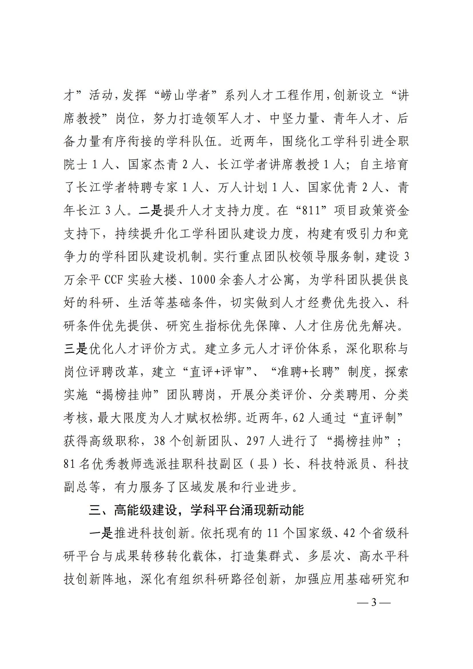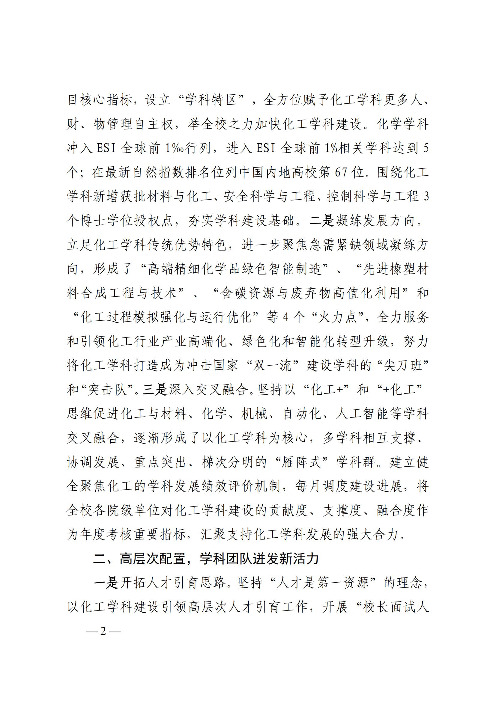 一是明确建设重心。将建好建强化工学科作为学校学科建设的“头号工程”,对标国家“双一流”建设标准和“811”项目核心指标,设立“学科特区”,全方位赋予化工学科更多人、财、物管理自主权,举全校之力加快化工学科建设。化学学科冲入ESI全球前1‰行列,进入ESI全球前1%相关学科达到5个;在最新自然指数排名位列中国内地高校第67位。围绕化工学科新增获批材料与化工、安全科学与工程、控制科学与工程3个博士学位授权点,夯实学科建设基础。二是凝练发展方向。立足化工学科传统优势特色,进一步聚焦急需紧缺领域凝练方向,形成了“高端精细化学品绿色智能制造”、“先进橡塑材料合成工程与技术”、“含碳资源与废弃物高值化利用”和“化工过程模拟强化与运行优化”等4个“火力点”,全力服务和引领化工行业产业高端化、绿色化和智能化转型升级,努力将化工学科打造成为冲击国家“双一流”建设学科的“尖刀班”和“突击队”。三是深入交叉融合。坚持以“化工+”和“+化工”思维促进化工与材料、化学、机械、自动化、人工智能等学科交叉融合,逐渐形成了以化工学科为核心,多学科相互支撑、协调发展、重点突出、梯次分明的“雁阵式”学科群。建立健全聚焦化工的学科发展绩效评价机制,每月调度建设进展,将全校各院级单位对化工学科建设的贡献度、支撑度、融合度作为年度考核重要指标,汇聚支持化工学科发展的强大合力。