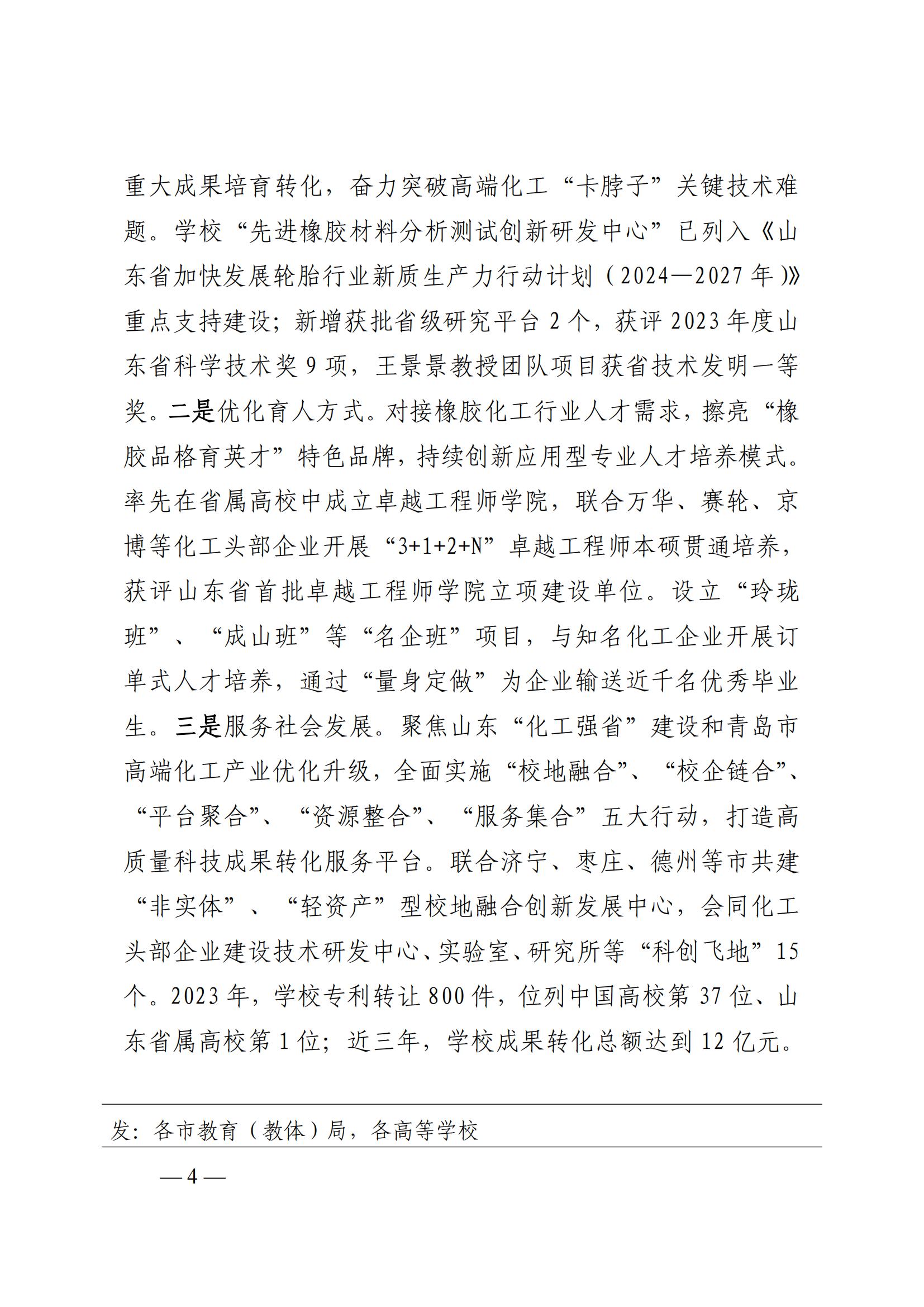 一是推进科技创新。依托现有的11个国家级、42个省级科研平台与成果转移转化载体,打造集群式、多层次、高水平科技创新阵地,深化有组织科研路径创新,加强应用基础研究和重大成果培育转化,奋力突破高端化工“卡脖子”关键技术难题。学校“先进橡胶材料分析测试创新研发中心”已列入《山东省加快发展轮胎行业新质生产力行动计划(2024—2027年)》重点支持建设;新增获批省级研究平台2个,获评2023年度山东省科学技术奖9项,王景景教授团队项目获省技术发明一等奖。二是优化育人方式。对接橡胶化工行业人才需求,擦亮“橡胶品格育英才”特色品牌,持续创新应用型专业人才培养模式。率先在省属高校中成立卓越工程师学院,联合万华、赛轮、京博等化工头部企业开展“3+1+2+N”卓越工程师本硕贯通培养,获评山东省首批卓越工程师学院立项建设单位。设立“玲珑班”、“成山班”等“名企班”项目,与知名化工企业开展订单式人才培养,通过“量身定做”为企业输送近千名优秀毕业生。三是服务社会发展。聚焦山东“化工强省”建设和青岛市高端化工产业优化升级,全面实施“校地融合”、“校企链合”、“平台聚合”、“资源整合”、“服务集合”五大行动,打造高质量科技成果转化服务平台。联合济宁、枣庄、德州等市共建“非实体”、“轻资产”型校地融合创新发展中心,会同化工头部企业建设技术研发中心、实验室、研究所等“科创飞地”15个。2023年,学校专利转让800件,位列中国高校第37位、山东省属高校第1位;近三年,学校成果转化总额达到12亿元。