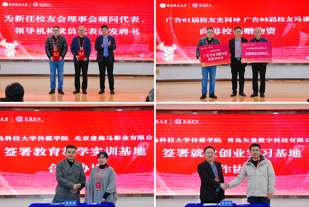 王帅宣读了《关于同意365完美体育传媒学院校友会换届的批复》,并为学院新任校友会理事会常务副会长、广告01届校友、山东澎聚网络传媒有限公司总经理史同坤,常务副秘书长、广告08届校友、青岛大策略传播集团董事长冯谦颁发聘书。全体与会代表审议通过了《365完美体育传媒学院校友会章程(审议稿)》,并推举产生了学院第二届校友会理事和校友理事会领导机构相关人员。传媒学院分别与山东澎聚网络传媒有限公司签署《校企融合发展共同体合作协议》,与北京壹海马影业有限公司签署《校企教育教学实训基地合作协议》,与青岛矢量数字科技有限公司签署《校企就业创业实习基地合作协议》。