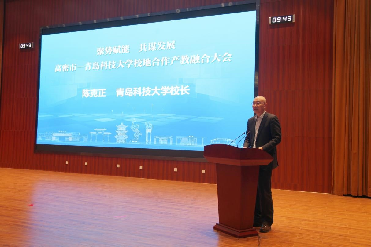 陈克正在致辞中介绍了学校发展及校地合作情况,并对高密市长期以来的关心支持表示感谢。他表示,此次大会为校地合作、产教融合搭建了一个广阔的交流平台,是高校、政府、企业三向奔赴、合作共赢的一次生动实践,也是加快推动科技创新和产业创新融合发展的有益探索。下一步,学校将坚持“服务国家战略、服务区域发展、引领行业进步”的战略目标,充分发挥学科专业优势特色和大学科技园高密校区园区、现代产业学院等平台作用,持续提升科技创新和成果转化效能,大力培育产业发展急需紧缺人才,为高密现代化产业体系建设和新质生产力培育发展,不断提供“青科大方案”、贡献“青科大力量”。