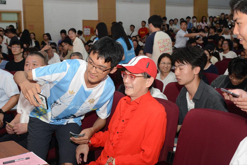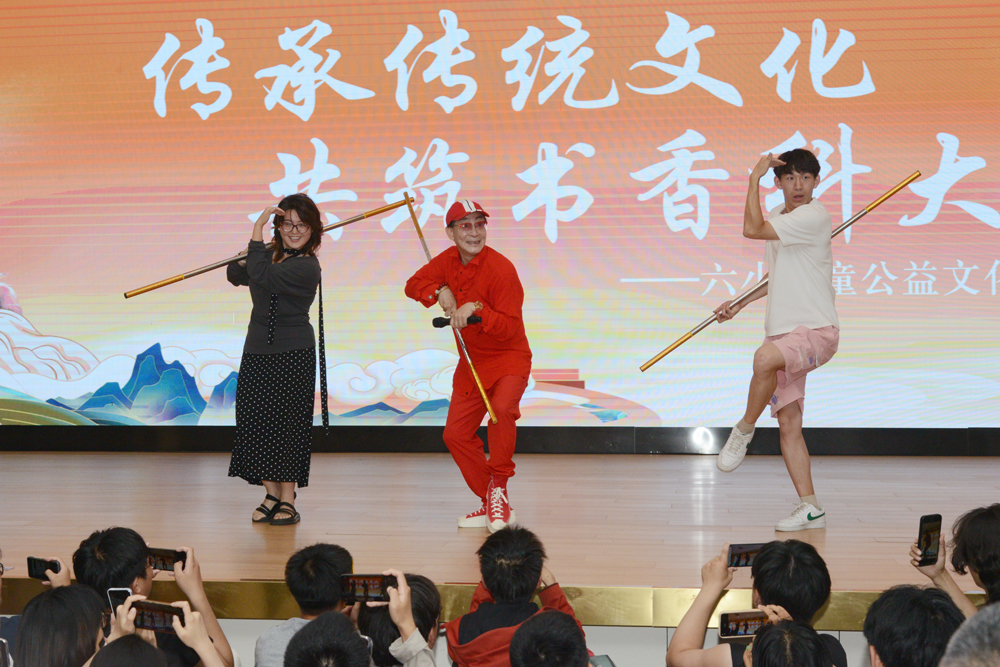 在“科大讲坛”上,身着红色外套的六小龄童精神矍铄,不断向现场观众挥手致意、合影留念。随着六小龄童一声“俺老孙来也”经典台词喊起,引发现场观众热烈鼓掌欢呼。六小龄童以“传承传统文化 共筑书香科大”为主题,讲述了《西游记》拍摄幕后故事、猴戏艺术渊源、个人从艺感悟,分享阅读对其艺术创作和人生成长的影响,鼓励大家多读书、悟经典,从传统文化中汲取勇敢、正义、执着的力量。活动期间穿插“美猴王”经典动作表演,六小龄童手持金箍棒,火眼金睛的神韵、行云流水的动作重现了荧幕中“美猴王”的灵动风采,现场师生踊跃参加互动表演,将活动推向高潮。