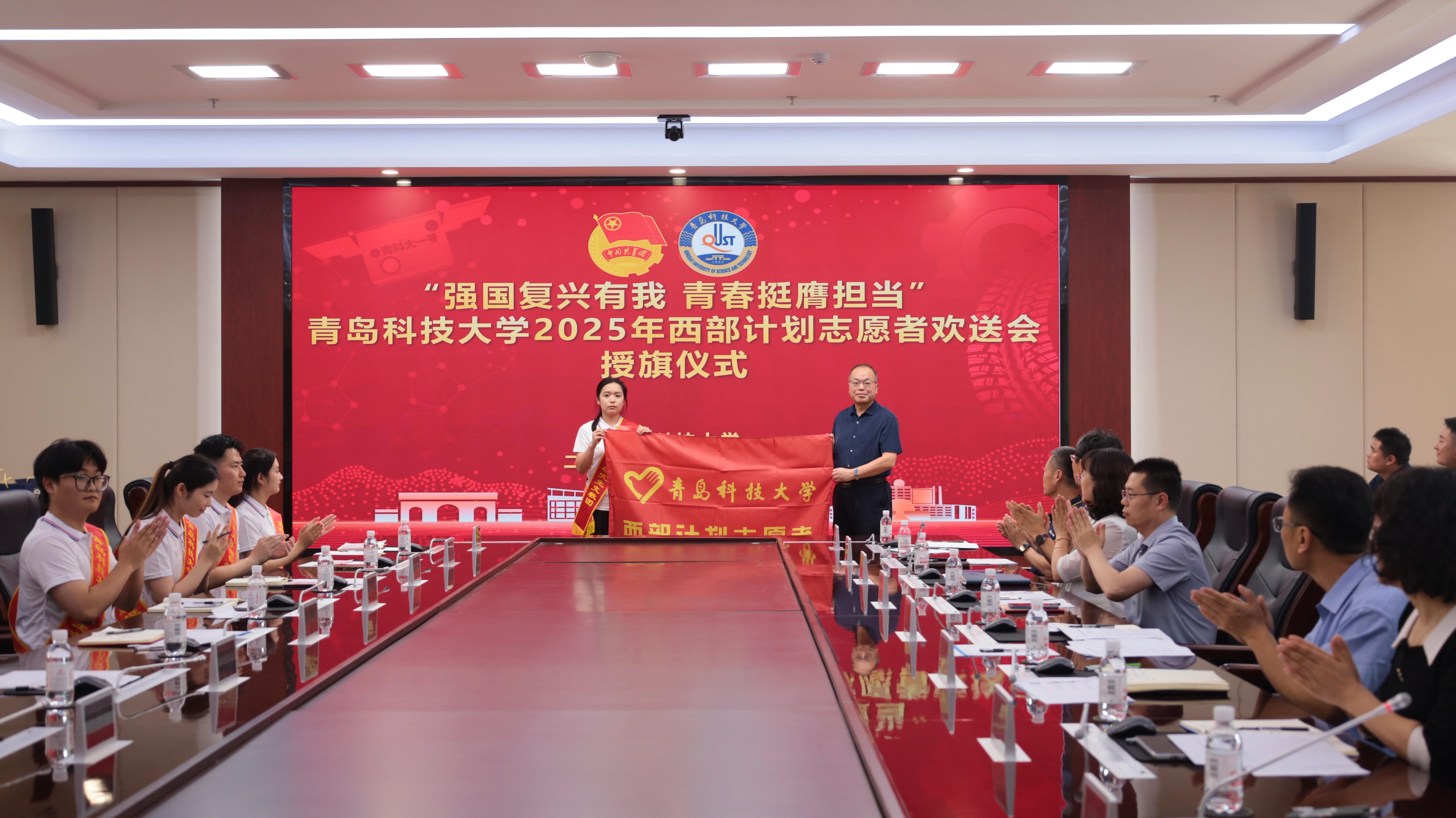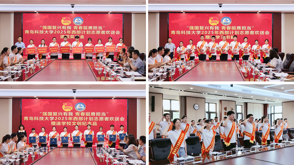 6月18日,学校“强国复兴有我 青春挺膺担当”2025年西部计划志愿者欢送会在崂山校区赛轮会议室举行。党委常委、副校长丁林,党委常委、宣传部部长张洪坤,党委常委、组织部部长朱敬义,党委常委、统战部部长秦姣出席活动。