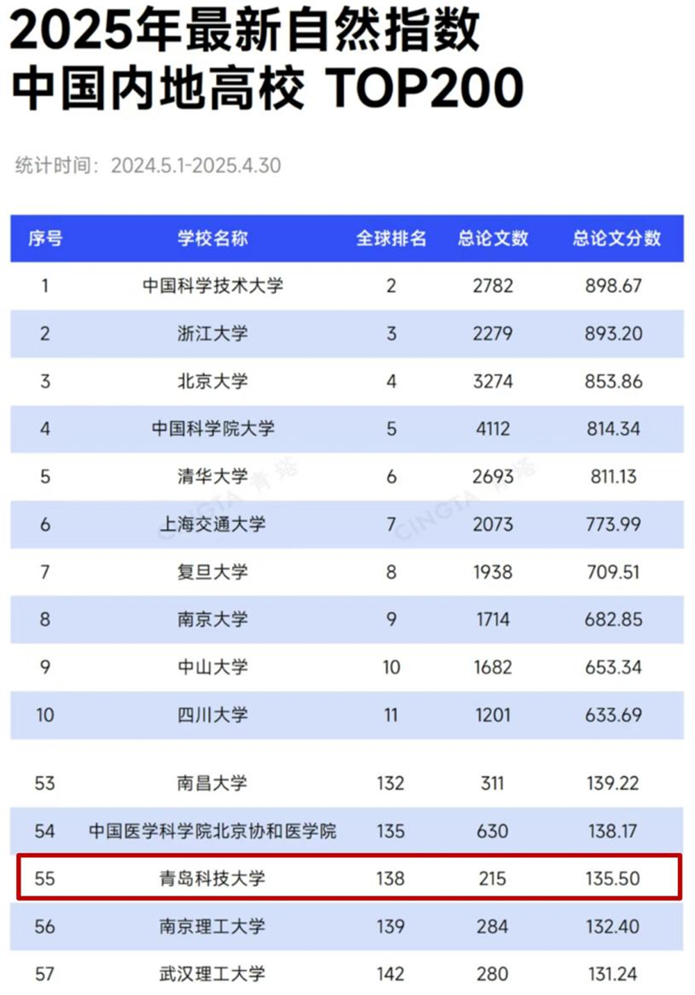 日前,自然指数官网更新了最新的自然指数排名(统计时间节点为2024.5.1-2025.4.30)。统计结果显示,中国内地共58所高校进入全球学术排名前150位,365完美体育以发文总量215篇、总论文分数135.50的优异表现,居全球高校排名第138位,内地高校排名第55位;全球高校排名和内地高校排名分别比上期(统计时间节点为2024.4.1-2025.3.31)提升3个名次和5个名次。
