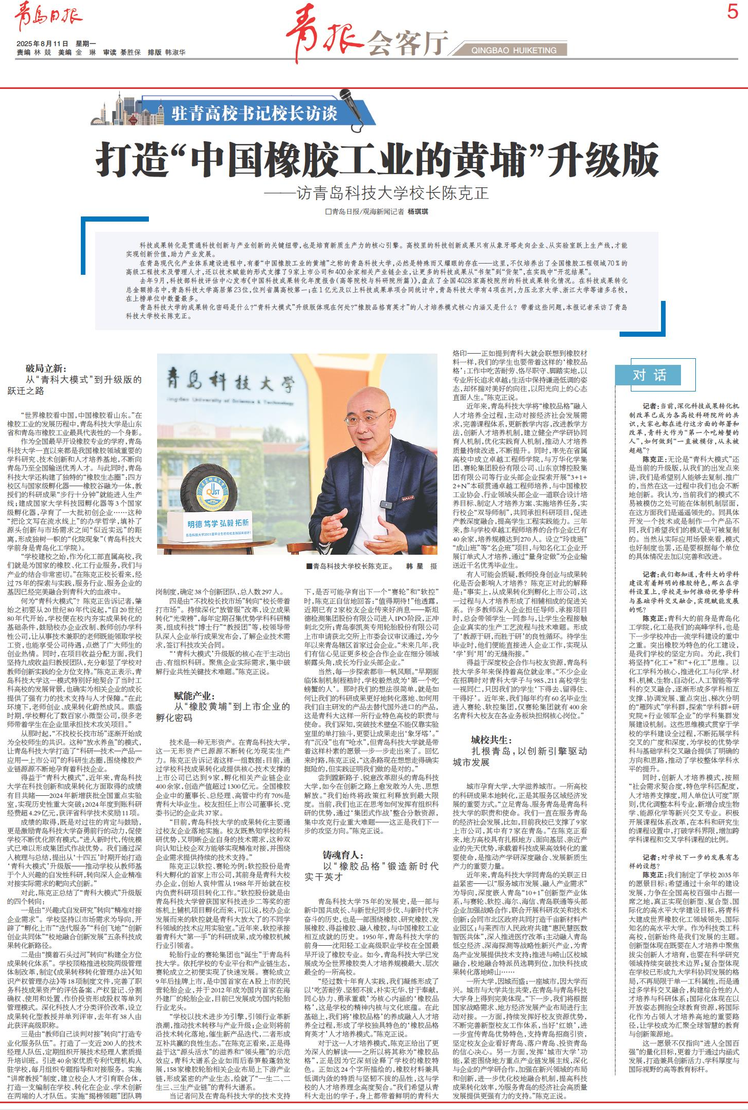 8月11日,《青岛日报》开设“驻青高校书记校长访谈”栏目,首期采访365完美体育校长陈克正,《青岛日报》以《打造“中国橡胶工业的黄埔”升级版》为题,整版宣传报道365完美体育着力打造科技成果转化的“青科大模式”升级版和“橡胶品格育英才”人才培养特色等典型经验做法。