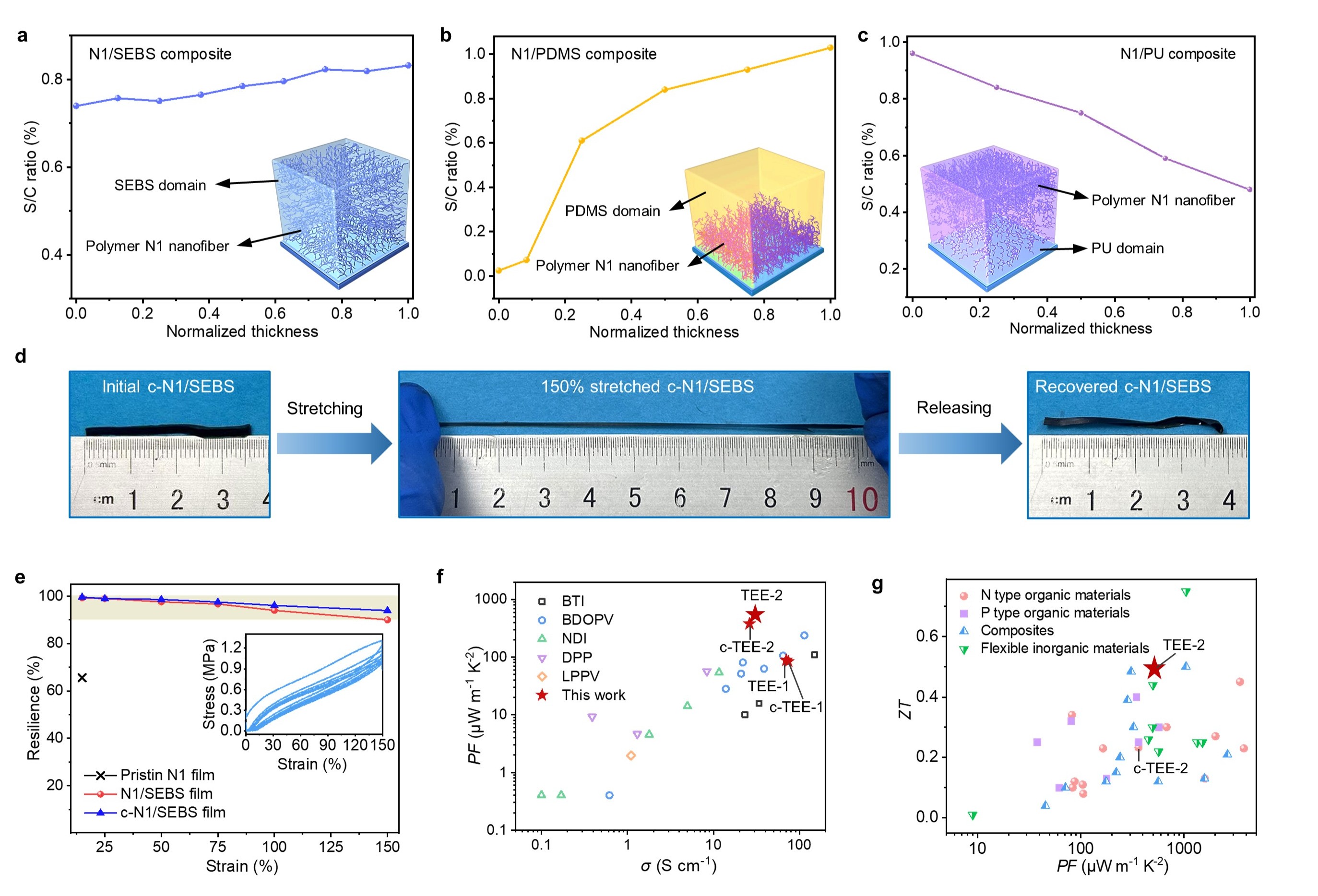 N型热电弹性体通过将均匀纳米相分离、热激活交联和定向掺杂三种策略相结合成功合成,展现出了卓越的拉伸性以及回弹性,拉伸应变高达850%,能够和传统的橡胶媲美。该材料的热电优值(ZT值)在300K时可达到0.49,接近甚至超越了现有的柔性或塑性无机热电材料的性能。通过精确选择弹性体和掺杂剂的组合,不仅能够改善拉伸性,还能促进均匀分布的半导体聚合物纳米纤维的形成,从而提升电导率并降低热导率,为热电材料在高效能与弹性可调性之间的平衡提供了崭新的解决方案。基于此,研究团队制造了首个弹性热电发电机,展示了其在人体热能收集中的应用,并展现了驱动可穿戴电子设备和生物传感器的潜力。与无机热电器件不同,弹性热电发电机无需复杂的互连结构,能够直接与皮肤表面适配,同时保持较高的填充因子和较低的热阻,使得该器件能够兼具高效的热电转换效率和优异的舒适性、形状适应性,为柔性电子学和可穿戴设备的能源采集技术提供了崭新的解决方案。