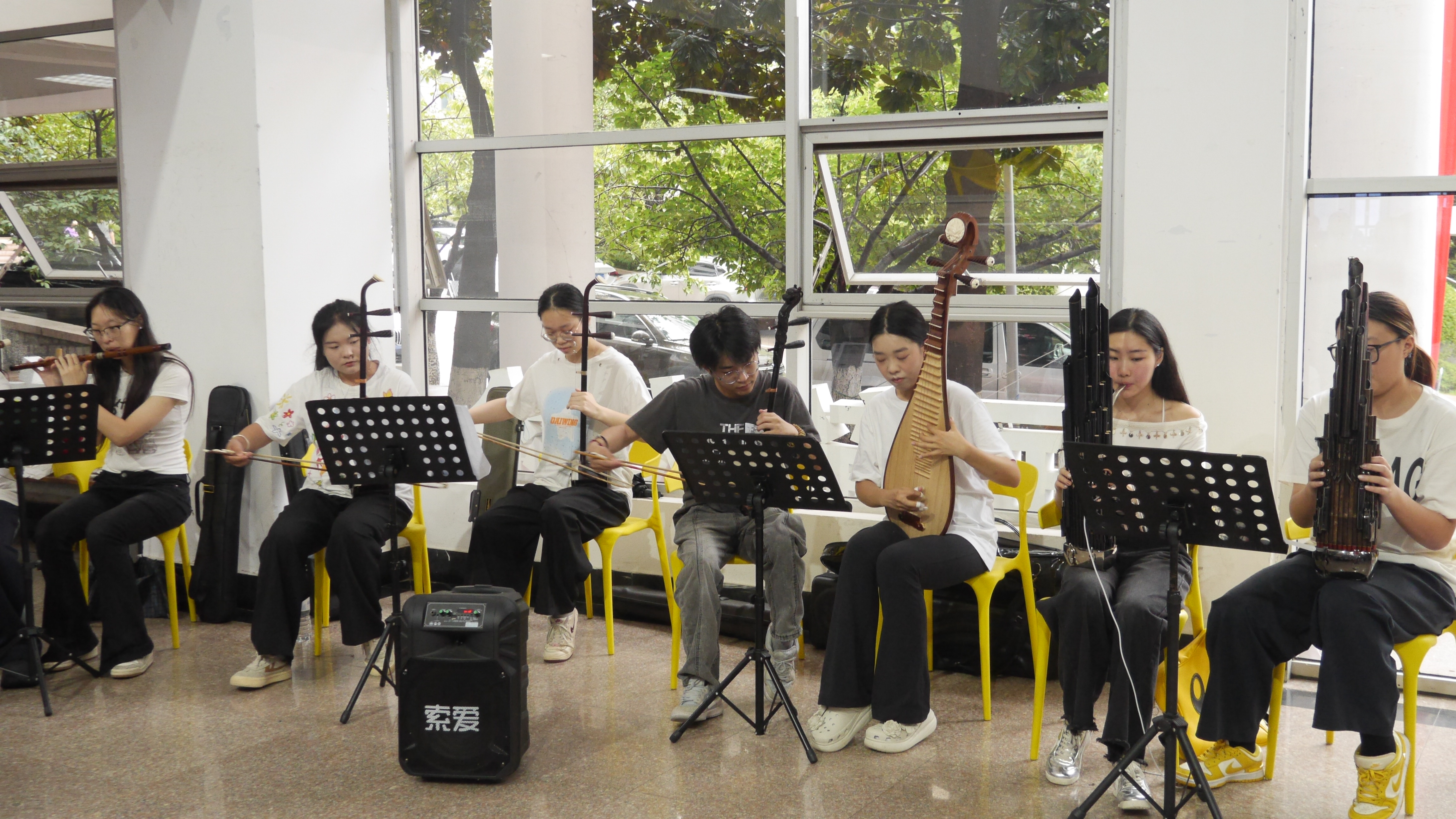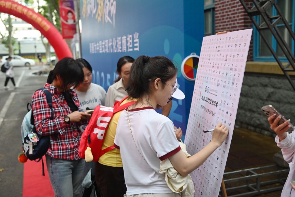 艺术学院在美术馆举办了师生优秀美术作品展,集中展出油画、国画、设计、雕塑、陶瓷等50余项作品,吸引了众多新生和家长驻足欣赏。报到现场特别设置了“共绘一幅画”互动区域,新生们纷纷执笔绘彩,共同创作,用艺术的形式表达对大学生活的美好憧憬。此外,音乐专业学生带来的精彩器乐表演,也成为迎新日中一道靓丽的艺术风景线。学院还设置了“纪念中国人民抗日战争暨世界反法西斯战争胜利80周年”知识竞答区,面向新生开展爱国主义教育,进一步深化“艺术+思政”的融合。