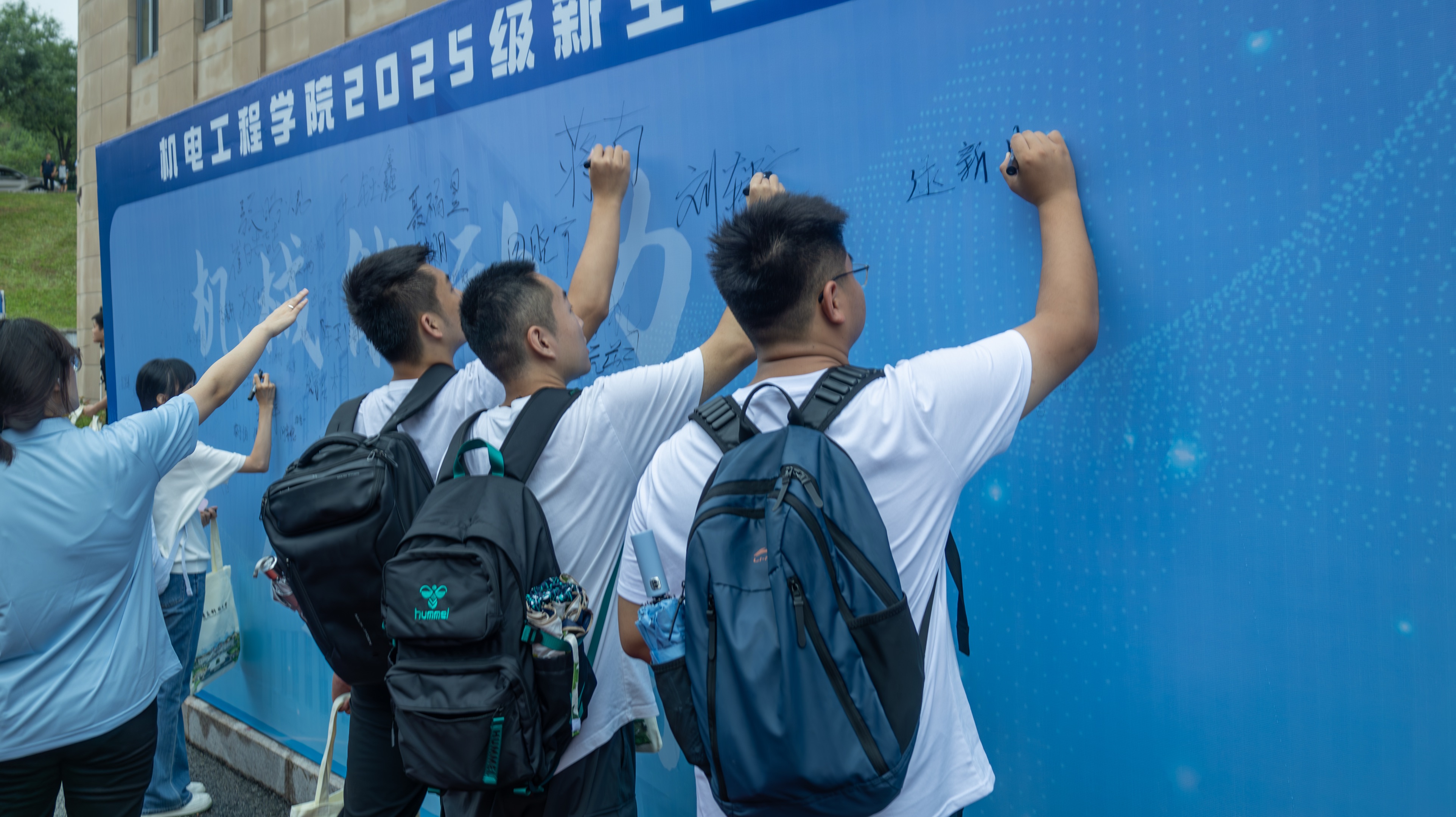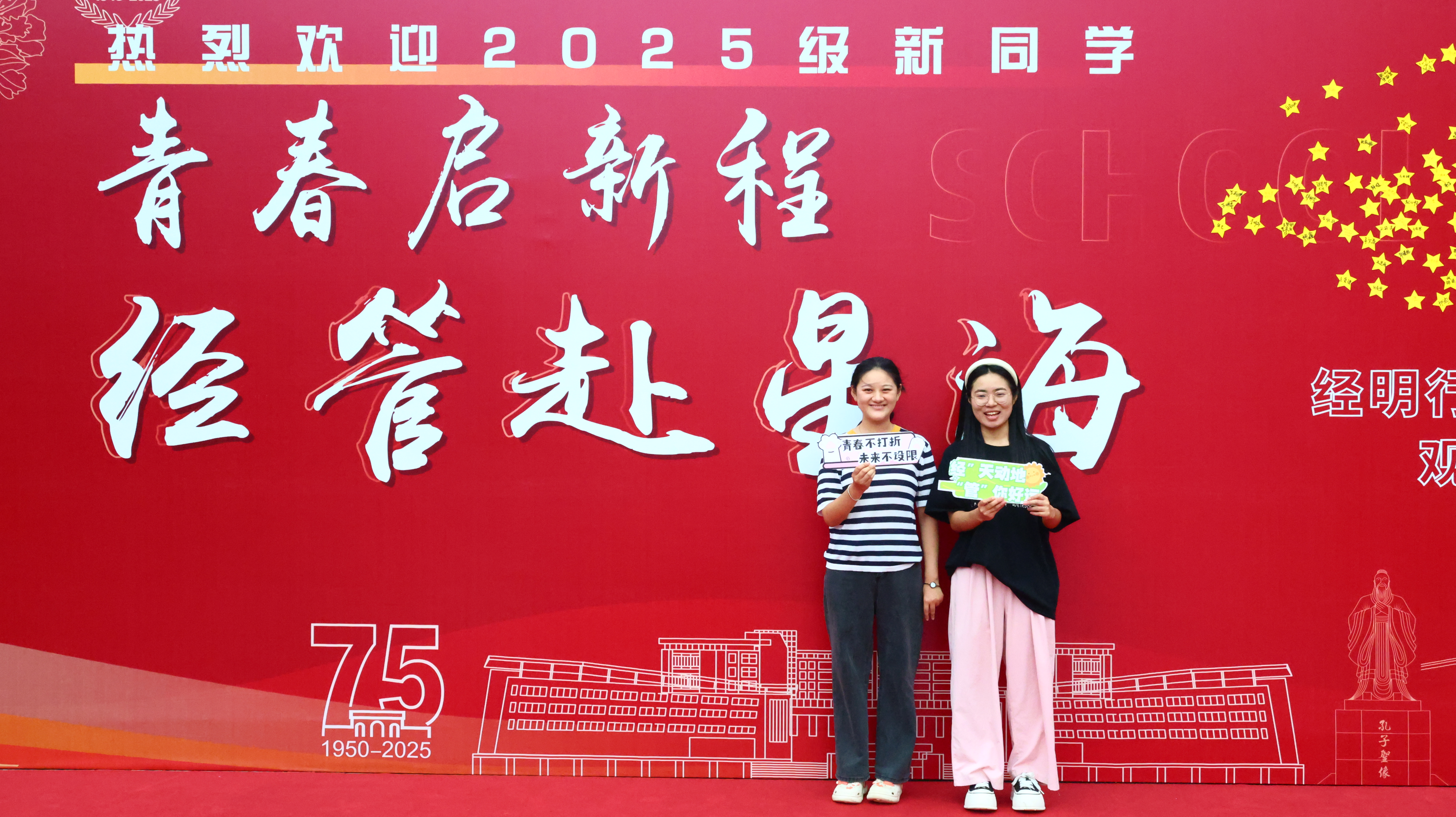 经济与管理学院以“青春启新程 经管赴星海”为主题,聚焦红色文化育人、校园文化育人和专业文化育人三个核心场景,构建了从“融入”到“启程”的迎新育人格局。“抗战胜利80周年”图景元素与“75周年校庆”场景元素纵横交织,贯穿中国经济发展史脉络阶梯,以新生亲笔签名的“星星之火”点亮中国式现代化宏伟历程;红毯连接“启程之路”,指引新生踏向由“我爱经管”主题雕塑构成的学科打卡点;领跑学长、迎新志愿者、党员骨干全程参与迎新准备和报到全过程,激发新生的归属感与认同感;实时动态更新的线上迎新图册将迎新现场搬上“云端”,指尖即可下载查看被镜头定格的每一个美好瞬间。