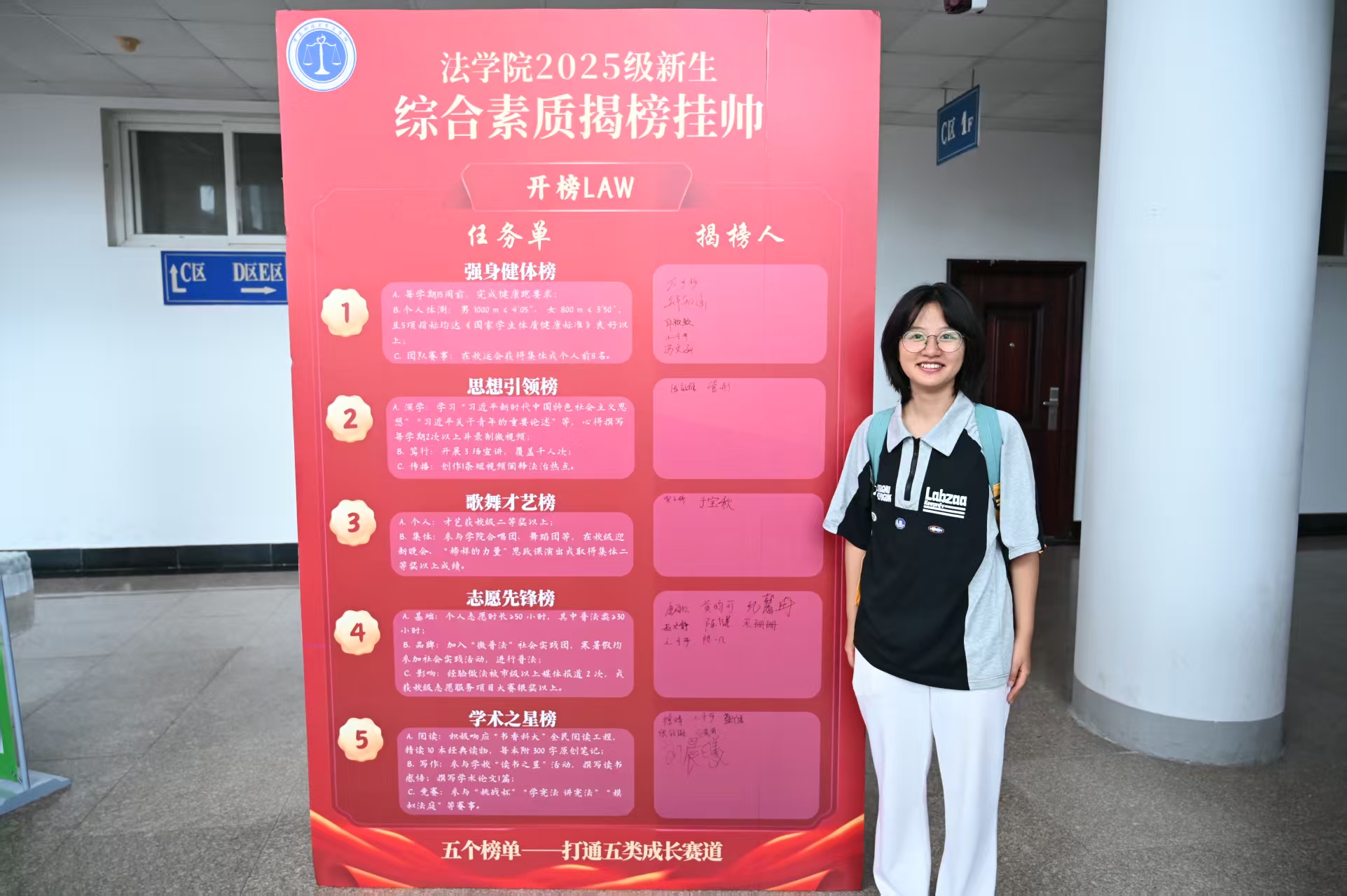 法学院前置服务“抢先跑”,通过校园开放日活动,让新生提前了解学院概况、专业情况,搭建家校沟通桥梁;开展“新生体能提升训练计划”活动,帮助新生以健康体魄迎接新生活。亮点活动 “添活力”,设立“初心信箱”,强化入党启蒙教育,加强思想引领;“综合素质揭榜挂帅榜”帮助新生明确个人发展目标,助力个人成长成才。暖心服务 “全覆盖”,学院优化报到流程,提升服务质量,圆满完成2025级新生报到工作。