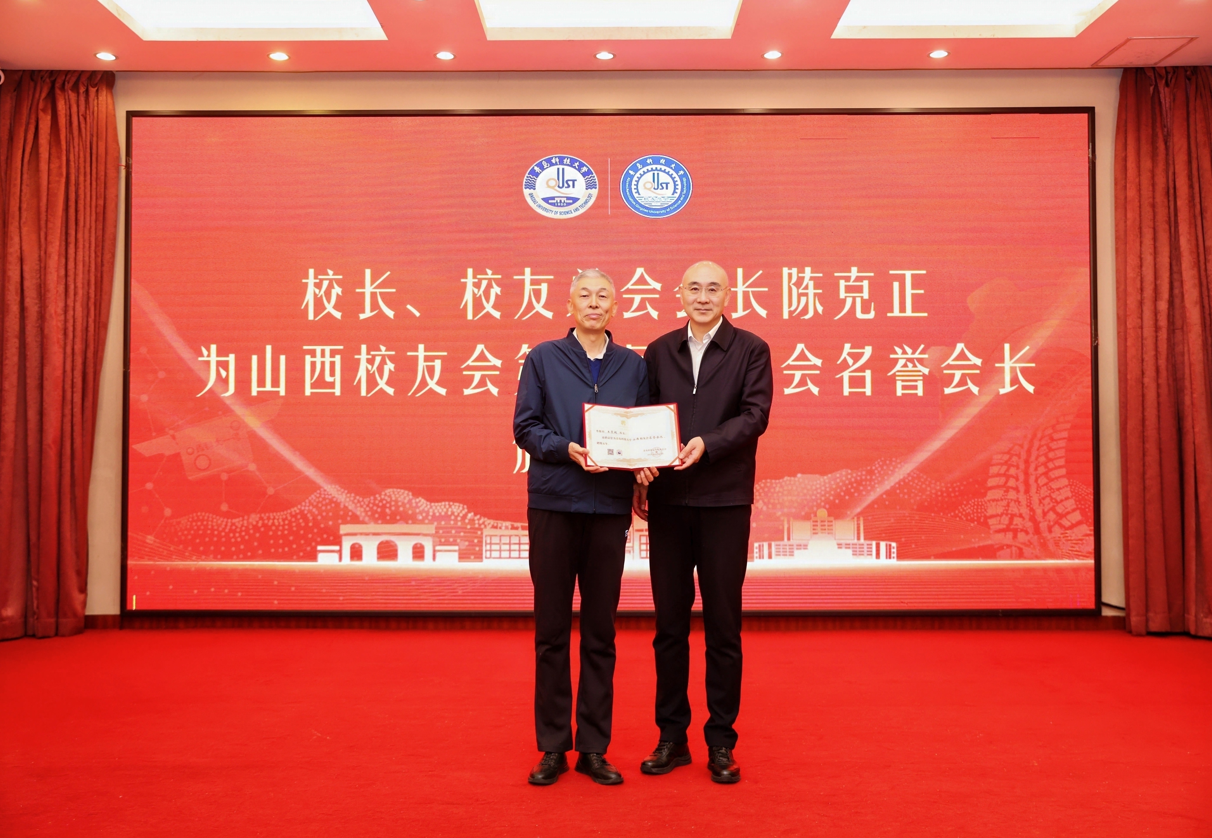 大会期间,陈克正为山西校友会第二届理事会名誉会长颁发聘书,为新换届的校友会授旗。