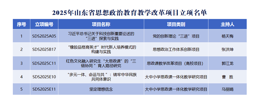近日,山东省教育厅公布2025年山东省思想政治教育教学改革项目立项名单,学校5项课题获批立项,覆盖党的创新理论“三进”项目、思想政治工作体系创新项目、思政课教学改革项目、大中小学思政课一体化教学研究项目等多个类别,集中展示了学校在思政育人方面的实践探索与积极成效。