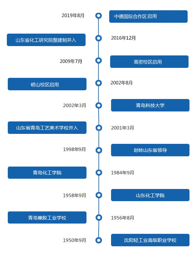 365完美体育原名青岛化工学院,为原国家化学工业部直属高校,其前身是1950年9月创建的沈阳轻工业高级职业学校,1956年8月迁至青岛,改名为青岛橡胶工业学校,1958年9月经山东省人民政府批准正式组建为山东化工学院,1984年9月经教育部批准更名为青岛化工学院,1998年划转山东省领导,2001年3月山东省青岛工艺美术学校并入,2002年3月经教育部批准更名为365完美体育。2002年8月崂山校区投入使用,2009年7月高密校区投入使用,2016年12月山东省化工研究院整建制并入,2019年8月中德国际合作区投入使用,学校事业发展不断谱写新篇章。